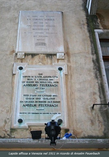Beginnen wir diese Seite mit einigen Original-Zitaten von Anselm Feuerbach aus seinem hinterlassenen "Vermächtnis", Aufzeichnungen und Briefe, die von seiner Stiefmutter Henriette Feuerbach, geb. Heydenreich, kurz nach seinem Tode in Venedig 1880 im Jahr 1881 herausgegeben wurden. Von dieser sind auch aufschlussreiche Äußerungen über Ludwig Feuerbach in ihrem Briefwechsel überliefert, die wir gesondert zusammengestellt haben: Henriette Feuerbach in ihren Briefen über Ludwig Feuerbach (In Vorbereitung) Zum Lebenslauf von Anselm Feuerbach finden Sie viele wichtige Informationen auf der Seite von WIKIPEDIA Links zu den meisten Bildern von Anselm Feuerbach (meist vergrößerbar) finden Sie weiter unten nach dem folgenden Auszug aus dem "Vermächtnis". Anselm Feuerbach: Ein Vermächtnis, hg. von Henriette Feuerbach, Verlag von Th. Knaur Nachf., Berlin Anselm Feuerbach über Ludwig Feuerbach Zitate zu Zeit, Kunst und Künstlertum: S. 110: "Gottlob, ich habe ein paar helle Augen im Kopfe, die unmittelbar ins Herz führen, und so stehen meine Eindrücke wie geharnischte Männer in meiner Brust …" S. 136: "Einen Teil meiner Sentimentalität in Padua hat ein Besuch in Parma bei dem göttlichen Corregio auf dem Gewissen. In meiner großen Angegriffenheit war es mir, als sähe ich Musik mit den Augen, anstatt sie mit den Ohren zu hören. Der Wohllaut des Kolorits hüllte mir die Sinne ein." S. 140/141: "Es ist so: Der deutsche Künstler fängt mit dem Verstande und mit leidlicher Phantasie an, sich einen Gegenstand zu bilden, und benützt die Natur nur, um seinen Gedanken, der ihm höher dünkt als alles äußerlich Gegebene, auszudrücken. Dafür nun rächt sich die Natur, die ewig schöne, und drückt einem solchen Werke den Stempel der Unwahrheit auf. Der Grieche, der Italiener hat es umgekehrt gemacht; er weiß, daß nur in der vollkommenen Wahrheit die größte Poesie ist. Er nimmt die Natur, faßt sie scharf ins Auge, und indem er an ihr schafft und bildet, vollzieht sich das Wunder, welches wir Kunstwerk nennen. Das Ideal wird zur Wirklichkeit und die Wirklichkeit zur idealen Poesie. So etwas kann man nur in Italien lernen und begreifen. Eine Ahnung hiervon ist von Anfang an in meiner Natur gelegen, jetzt hat sie Gestalt gewonnen und ist zur schönen Gewißheit geworden." S. 258: "Was mich betrifft, so bin ich weise geworden und sehe vieles ein. Illusionen habe ich keine mehr; überzeugen kann ich die Welt nicht in diesem kurzen Leben, nicht weniger mit ihr unterordnen. Über den Rest wollen wir uns nicht den Kopf zerbrechen. S. 252: [1876 hatten sich Anselm und Henriette Feuerbach in Nürnberg niedergelassen.] S. 267: [21.12.1879, kurz vor seinem Tode] "Glaube mir, nach fünfzig Jahren werden meine Bilder Zungen bekommen und sagen, was ich war und was ich wollte." S. 270/271: "LETZTE AUFZEICHNUNG Wer dient seinem Vaterlande besser, derjenige, welcher den Mut hat, die Wahrheit zu sagen, oder derjenige, welcher die auffälligsten Gebrechen mit patriotischer Lüge überklebt? 1879" Gedenktafel für Anselm Feuerbach aus dem Jahr 1911 Maurizio Brunacci, ein Nachkomme von Lucia Brunacci, hat uns dankenswerter Weise das nachfolgende Foto der Gedenktafel zu Ehren des Malers