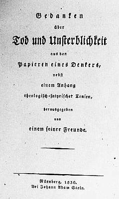 von diesem Total-Angriff auf das Christentum; die Aufklärungswilligen bejubelten wie etwa Marx und Engels diese Befreiungstat, während von christlicher Seite sein Erstling, die "Gedanken über Tod und Unsterblichkeit" beschlagnahmt und ihm die berufliche Zukunft verbaut wurde. |