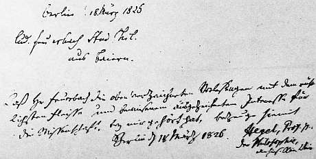 Ausschnitt der Vorlesungsbestätigung für die drei Semester SS 1824, WS 1824/25, SS 1825 mit der Unterschrift Hegels; dieser bestätigt "Lud. Feuerbach Stud. Phil. aus Baiern" am 18. März 1825, daß er unter anderem die folgenden Vorlesungen bei ihm gehört habe: Metaphysik und Logik, Religionsphilosophie, Philosophie der Weltgeschichte, Naturrecht und Staatsphilosophie, Psychologie, Anthropologie, Geschichte der Philosophie, Philosophie der Natur. "Daß Herr Feuerbach die oben verzeichneten Vorlesungen mit dem rühmlichsten Fleiße und bewiesenem ausgezeichneten Interesse für die Wissenschaft bey mir gehört hat, bezeuge hiemit Berlin d. 18. März 1826. Hegel, Prof. Dr. der Philosophie, ..."