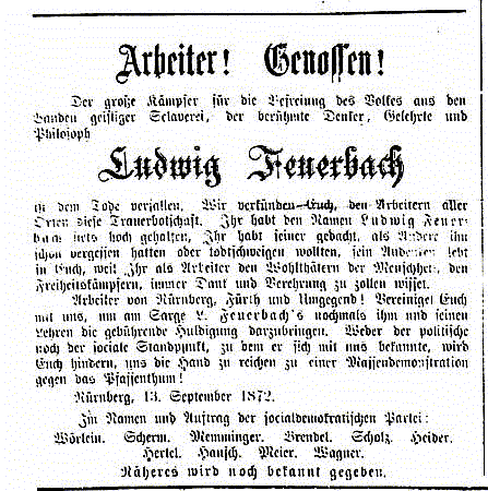 Die sozialdemokratische Arbeiterschaft in Nürnberg nahm regen Anteil am Tode von Ludwig Feuerbach, wie der folgende